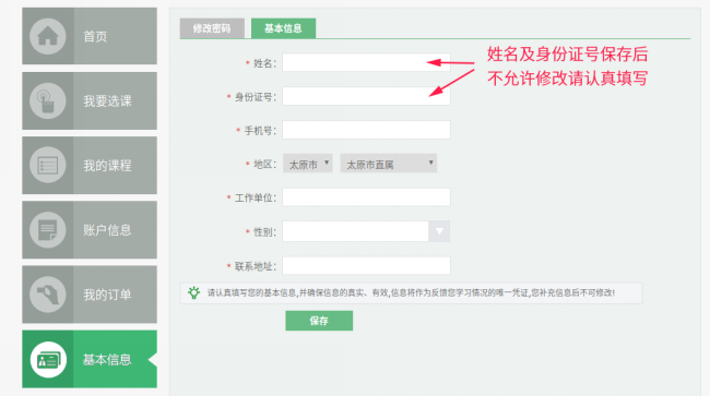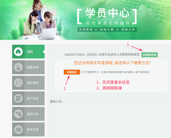 首次登录后,1、先修改基本信息 2、网银购课