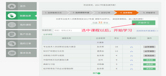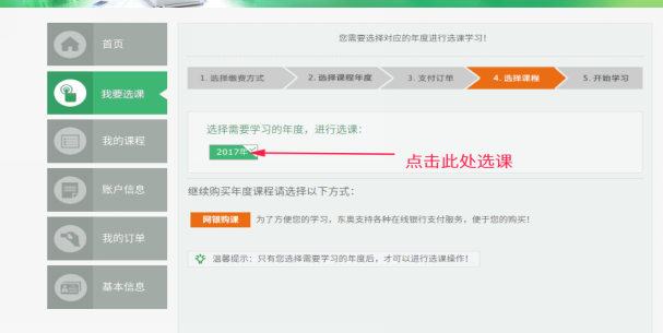 点击左侧导航栏中的‘我要选课’栏目,选中要学习的年度并点击进入选课。